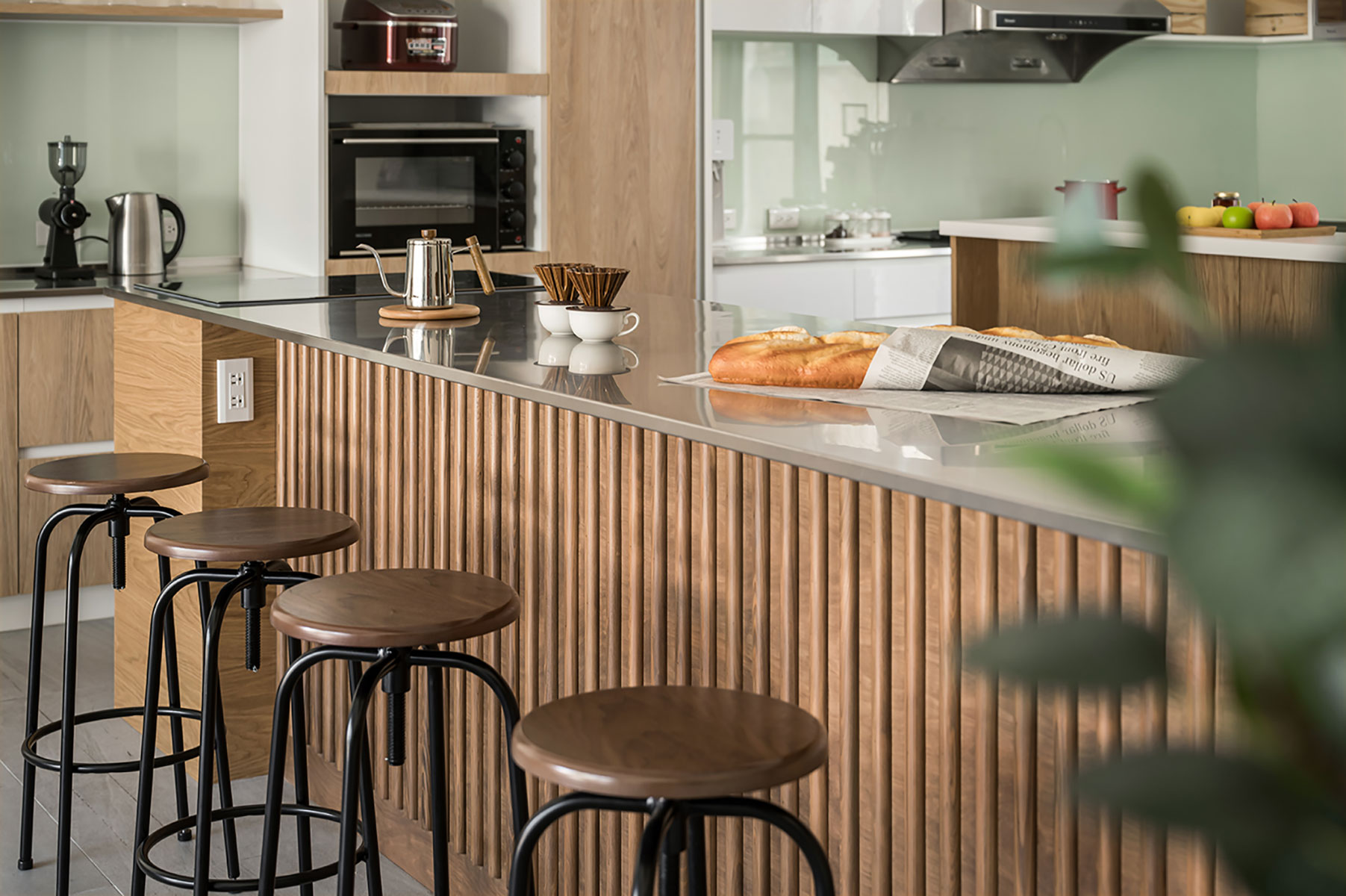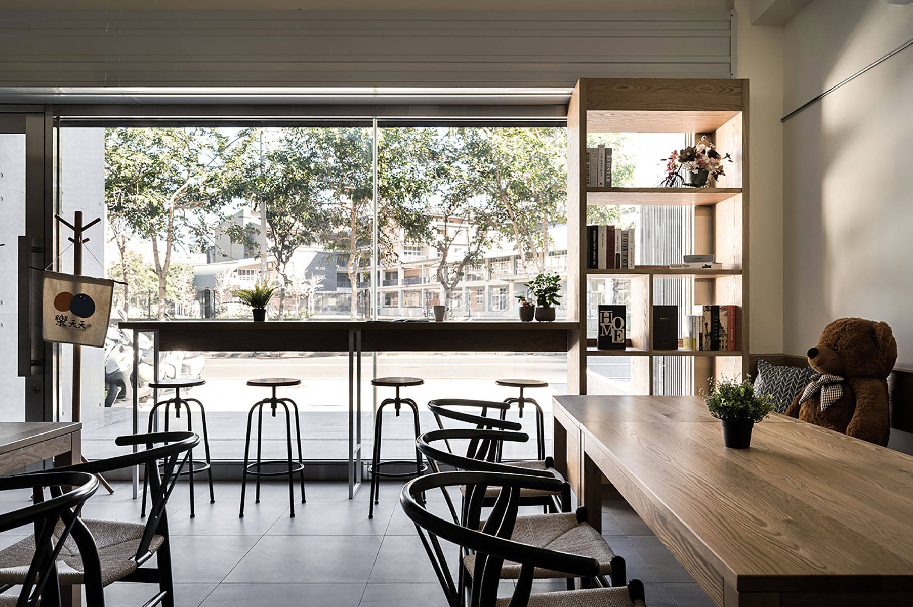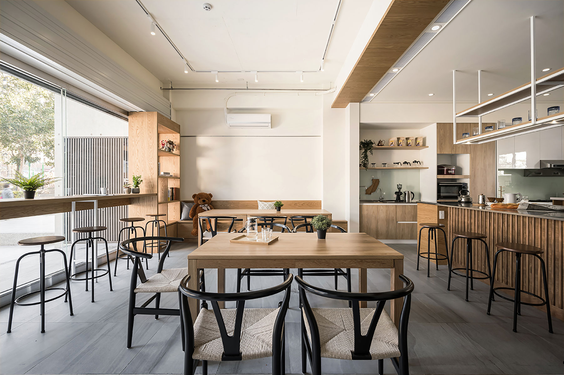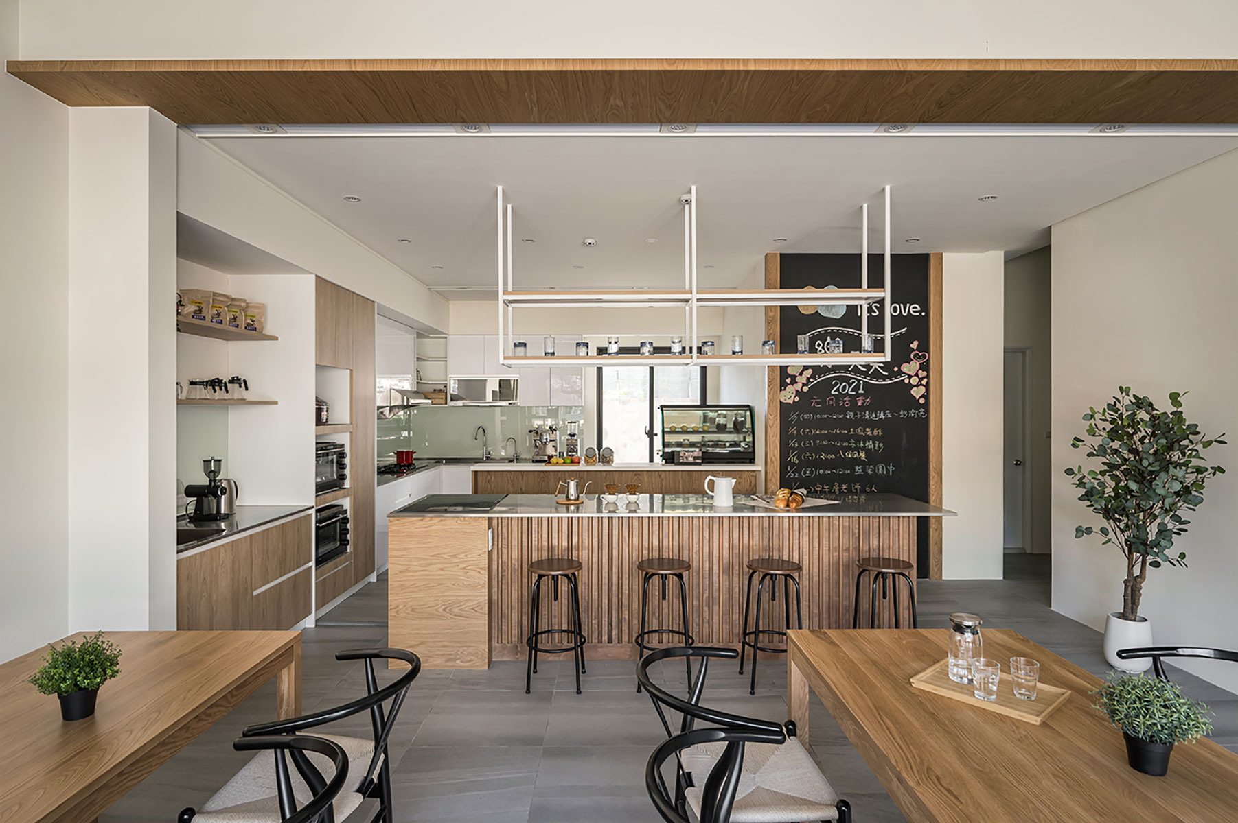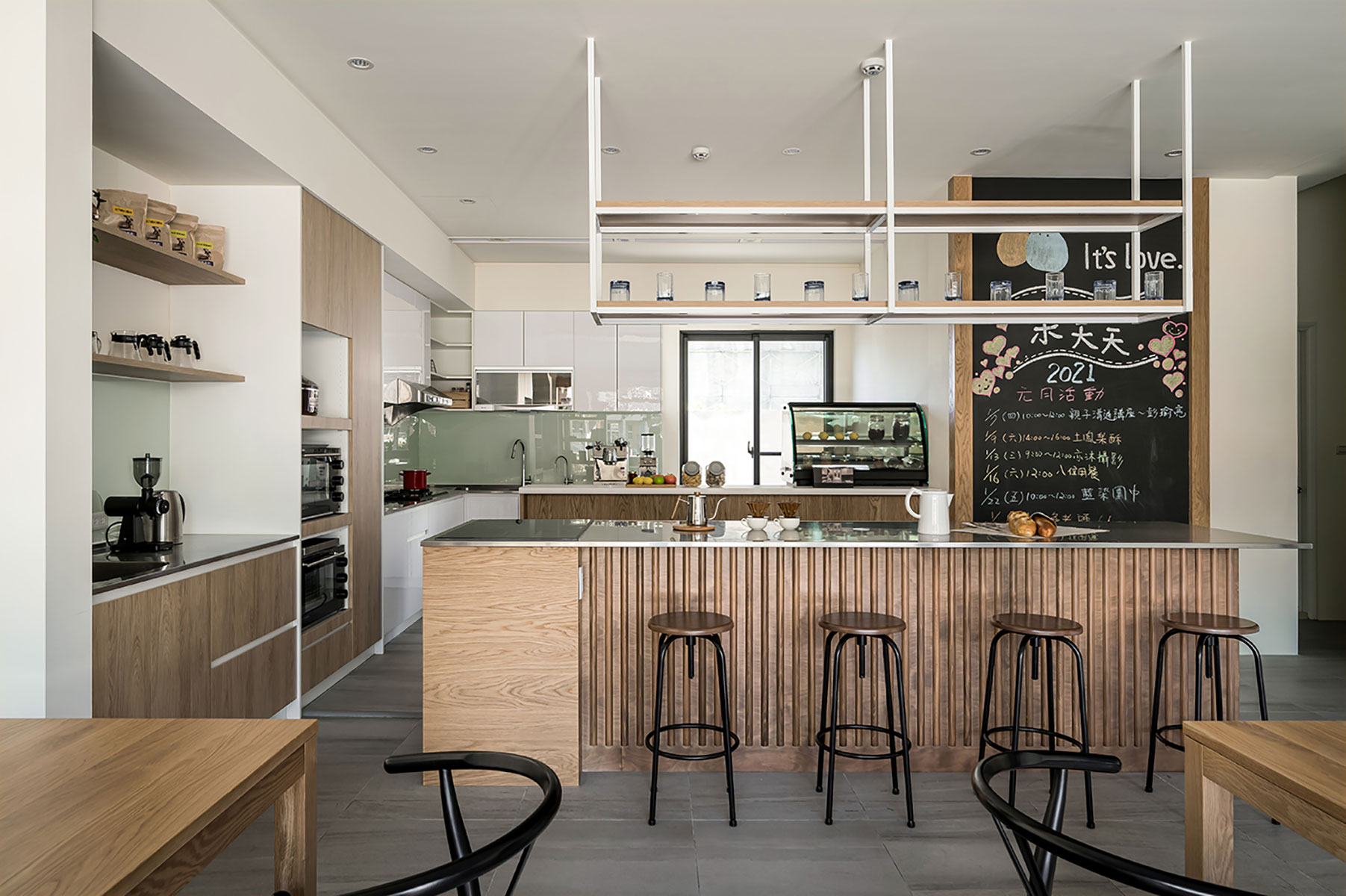 設置完備專業的廚具,於空間中央設大中島,作為教學的示範台,大夥也能圍在此一起操作,溫馨且無距離感;座位區供學生或客人作業及用餐,窗邊設置高吧台桌椅,讓人在此享受愜意的時刻。