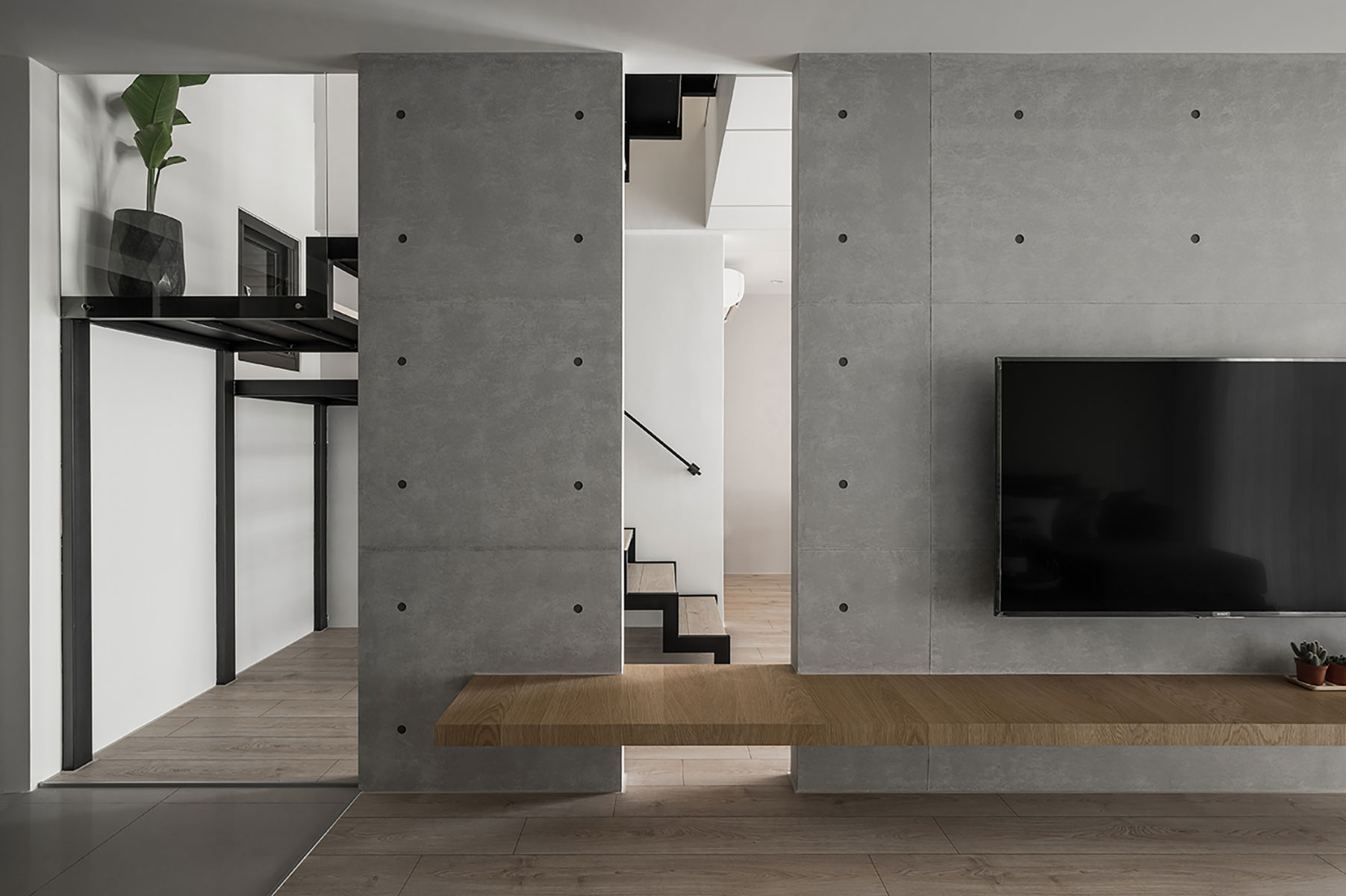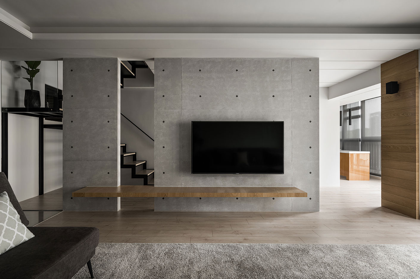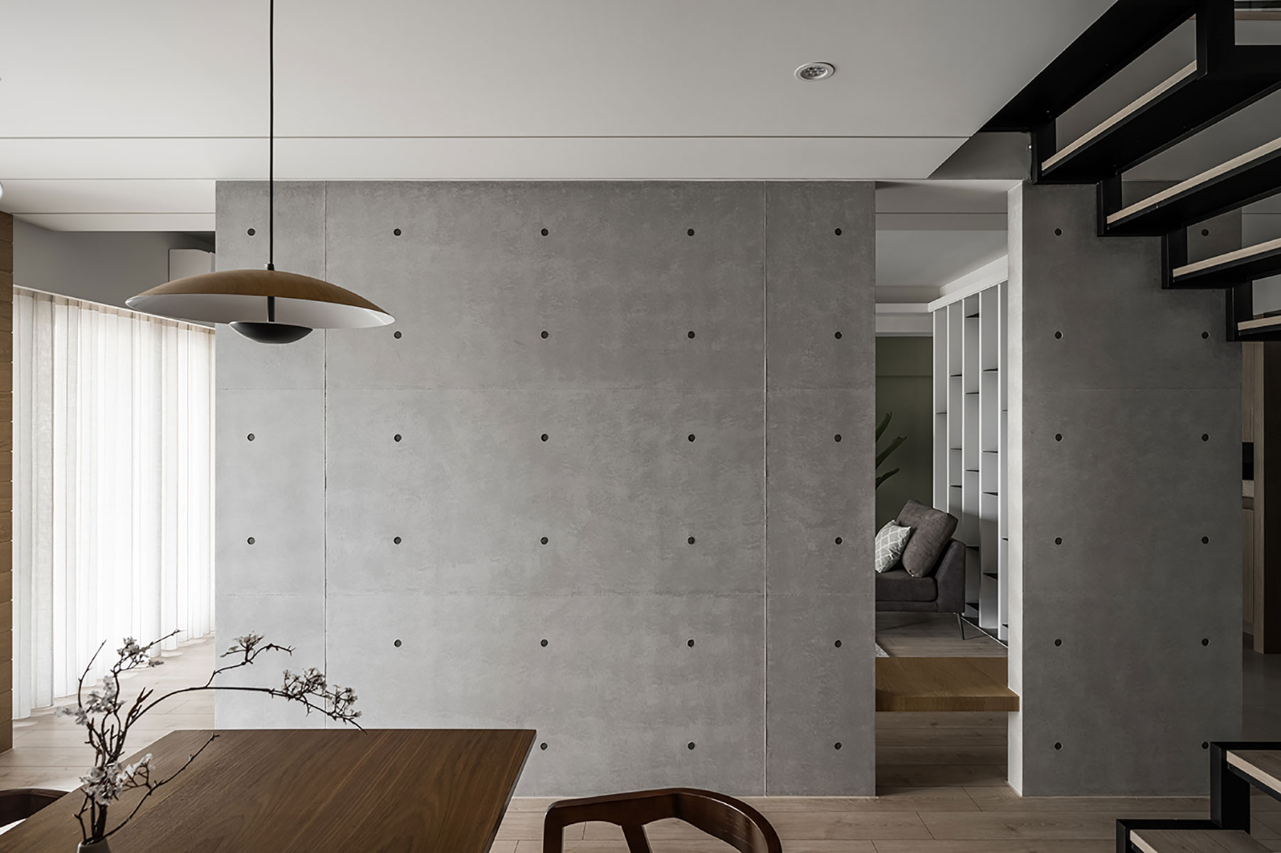 此案為一戶重新翻修的案例,原有空間在裝修上加諸了過多不必要的裝飾面,造成了動線與視野過於繁雜與零碎。設計師以虛實交替的手法,重新以光為媒介引領動線,輔以理性的線性思維與清水模的材質特性,轉化成場域界定的分野。