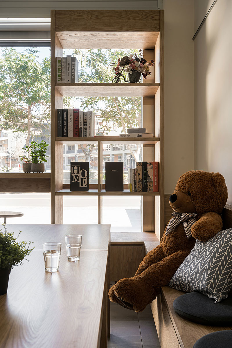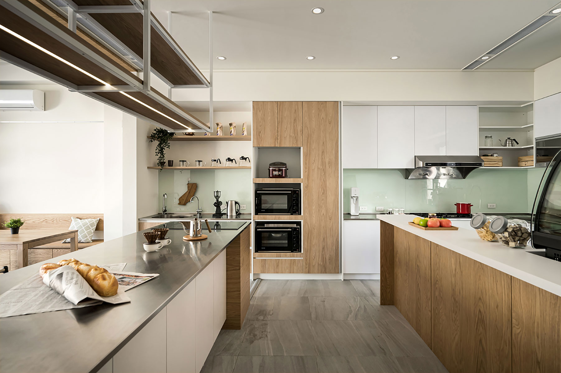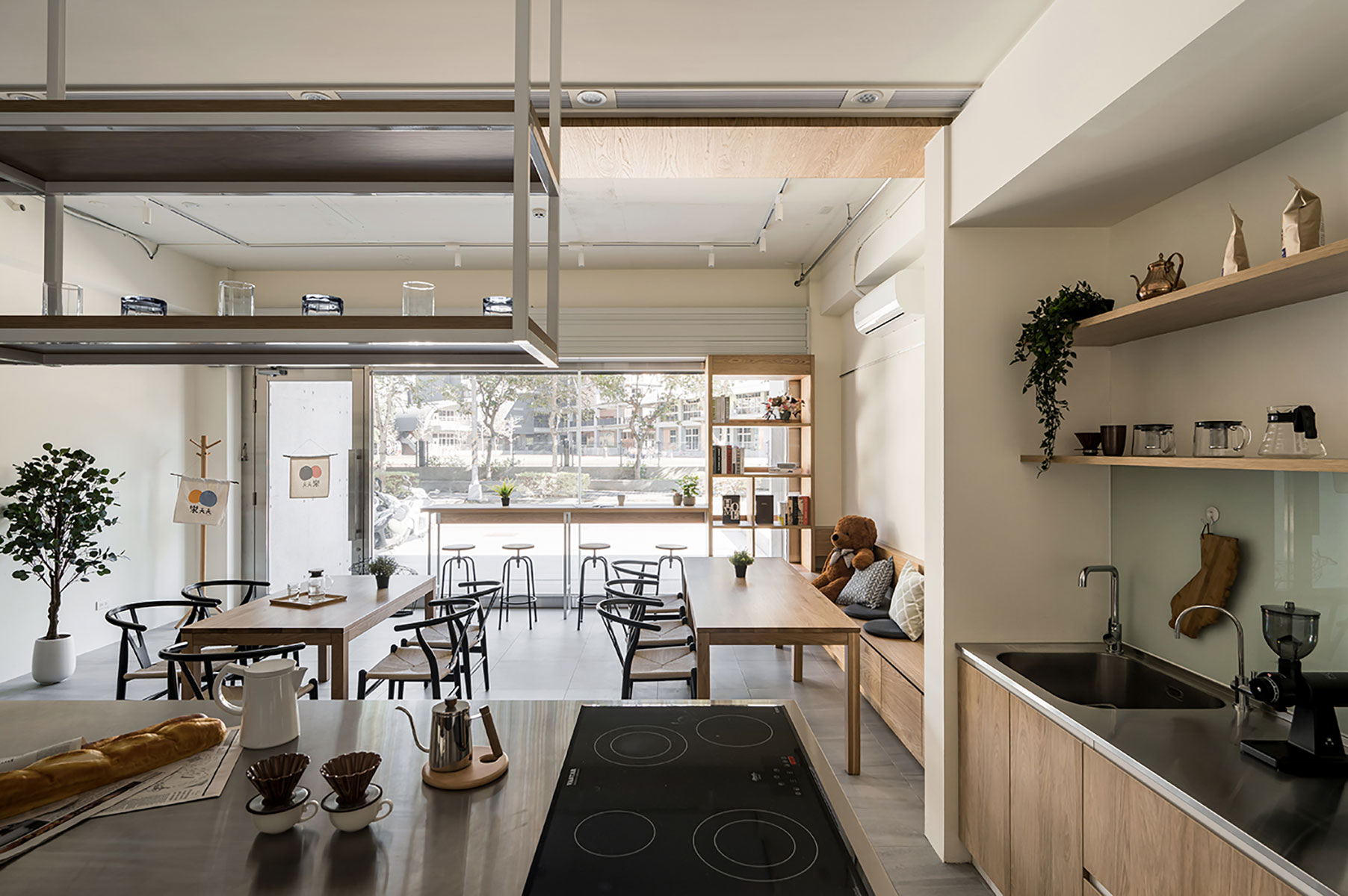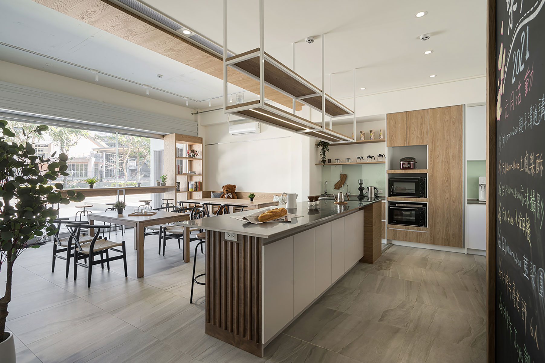 設置完備專業的廚具,於空間中央設大中島,作為教學的示範台,大夥也能圍在此一起操作,溫馨且無距離感;座位區供學生或客人作業及用餐,窗邊設置高吧台桌椅,讓人在此享受愜意的時刻。