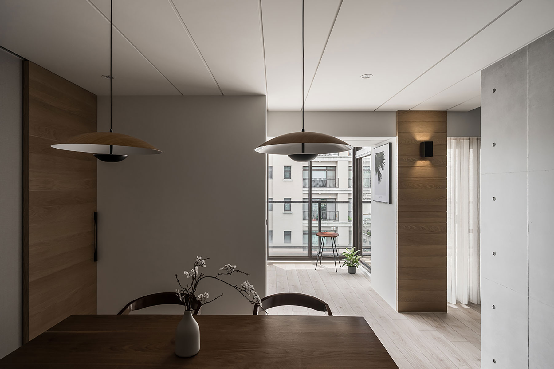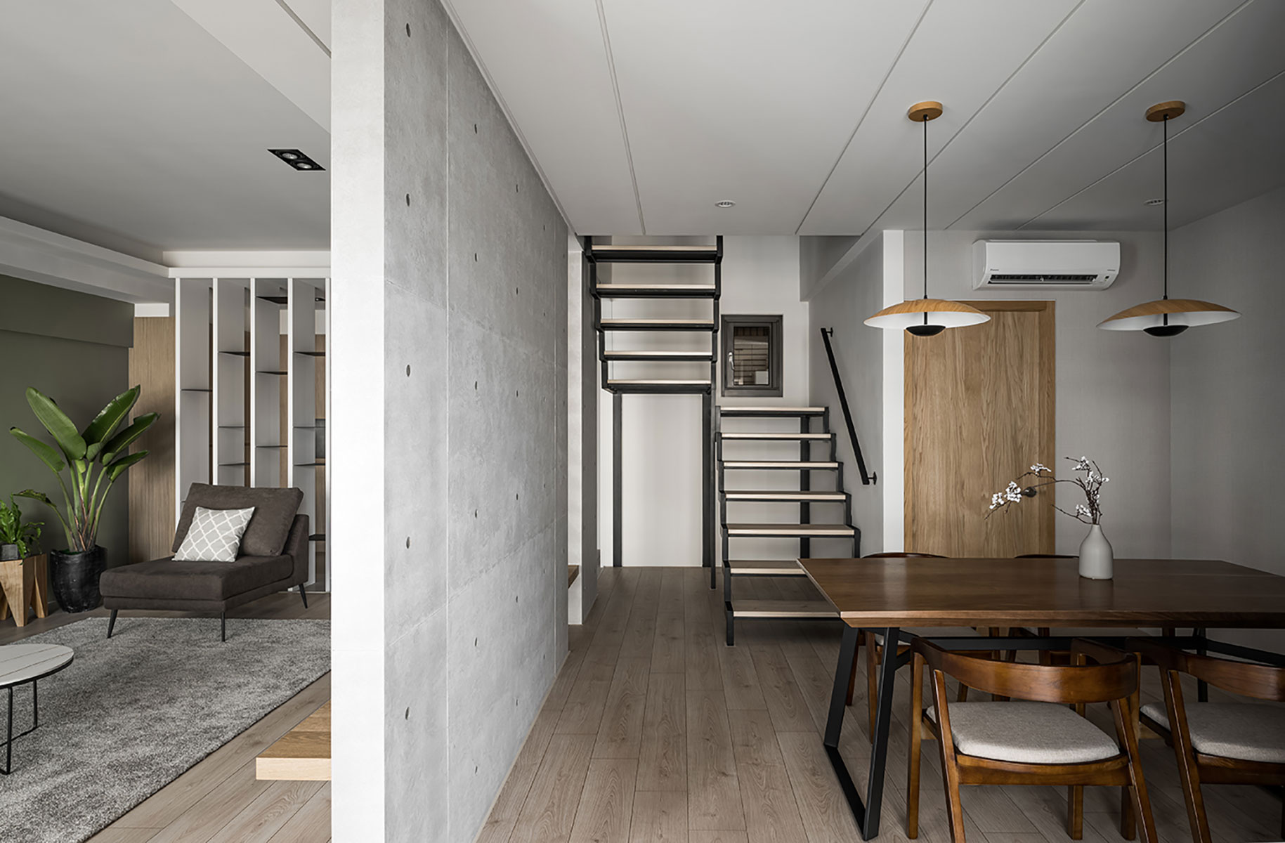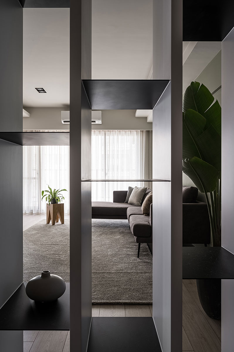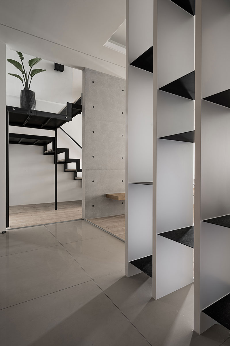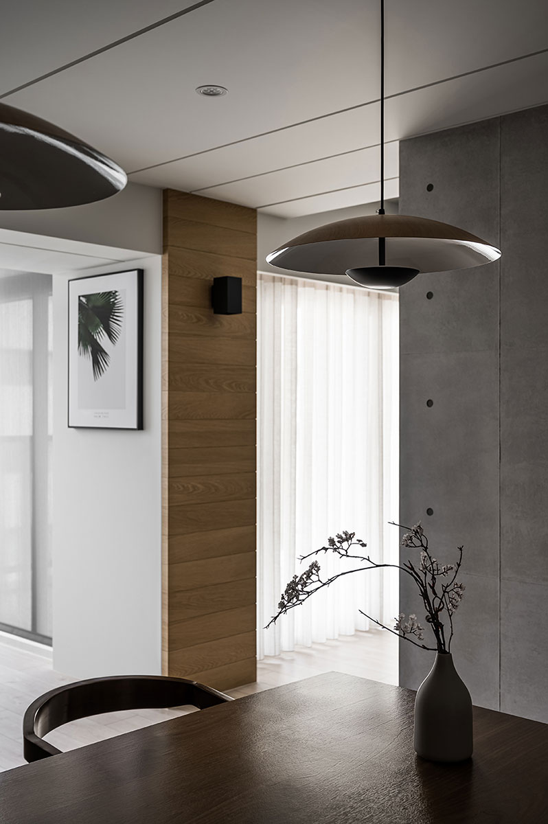此案為一戶重新翻修的案例,原有空間在裝修上加諸了過多不必要的裝飾面,造成了動線與視野過於繁雜與零碎。設計師以虛實交替的手法,重新以光為媒介引領動線,輔以理性的線性思維與清水模的材質特性,轉化成場域界定的分野。